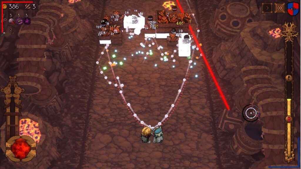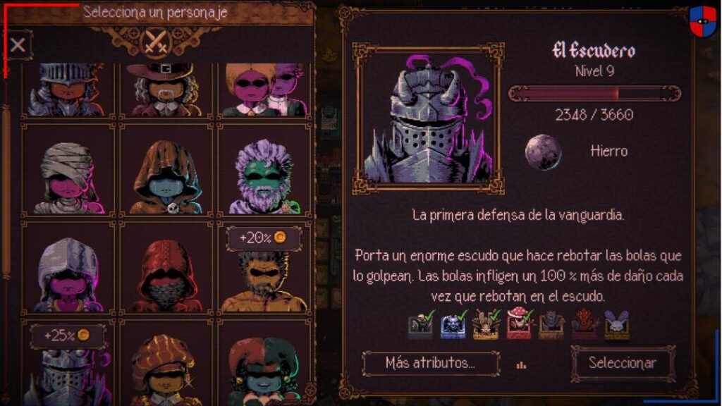 A todo esto, algunas estructuras nos permiten desbloquear nuevos héroes. Lo interesante es que cada personaje es mucho más que un simple cambio estético, puesto que sus características pueden alterar drásticamente la forma en que abordamos cada run. Por ejemplo, ‘La Sombra’ dispara bolas pero desde la parte posterior de la pantalla golpeando a los enemigos por la espalda, mientras que ‘Los Gemelos’ lanzan el doble de esferas aunque estas causan la mitad del daño. Con estas variantes, BALL x PIT nos obliga a pensar y repensar estrategias. Pero para mejor, la cosa se vuelve todavía más interesante cuando llega el punto en que podemos enviar a dos expedicionarios juntos.