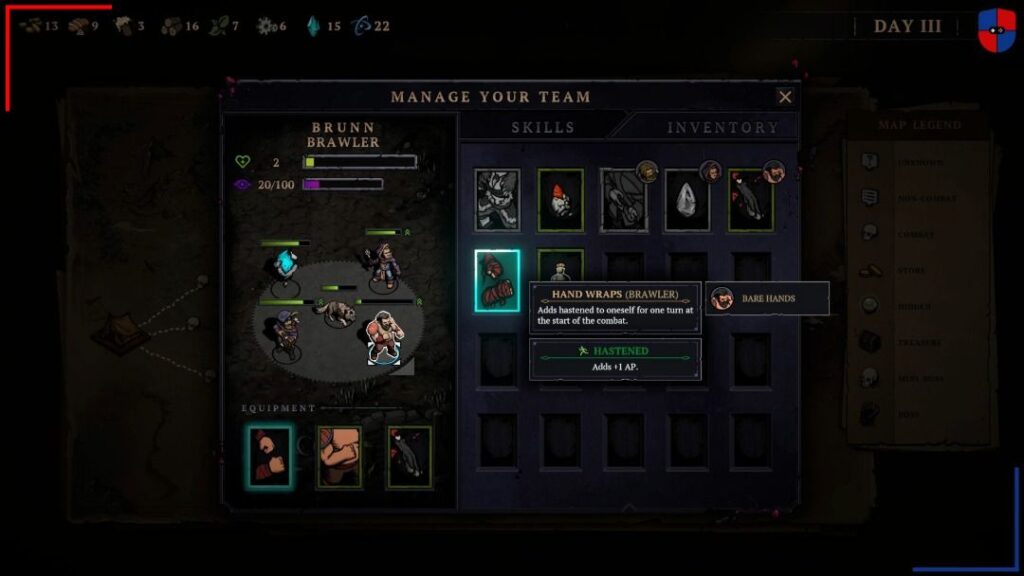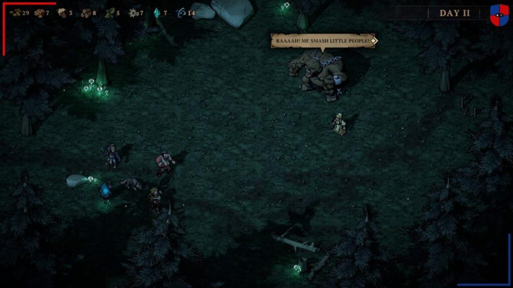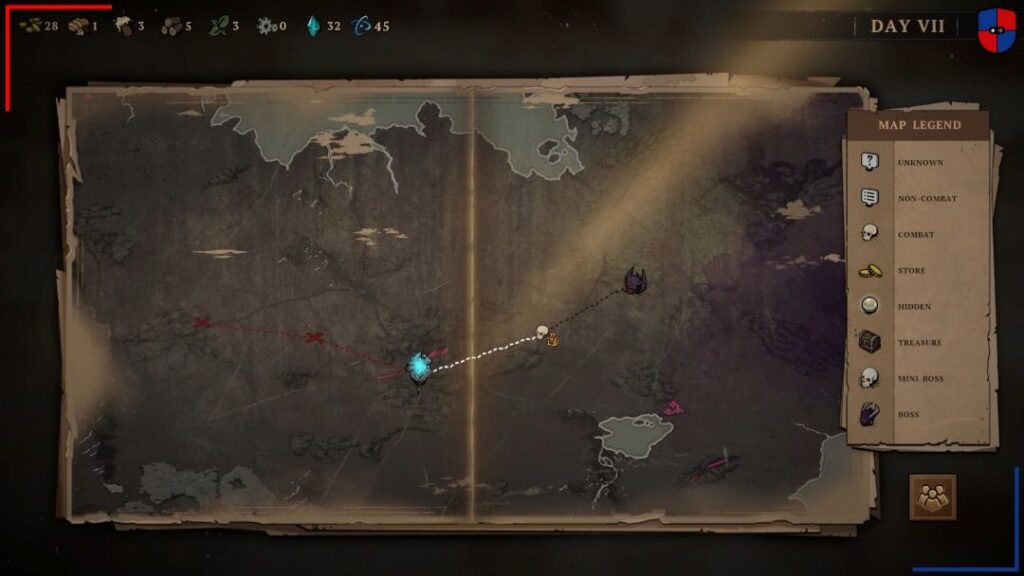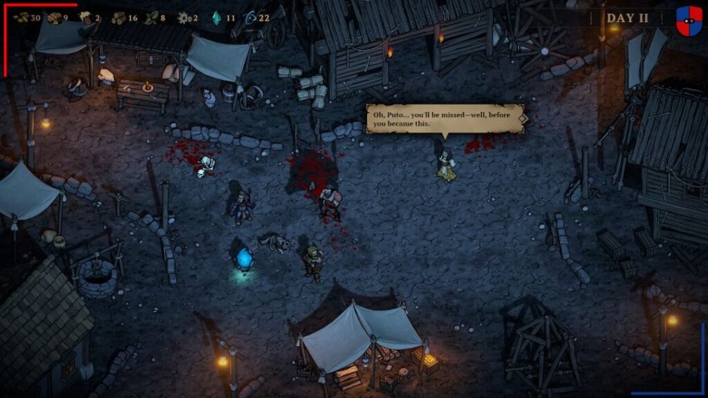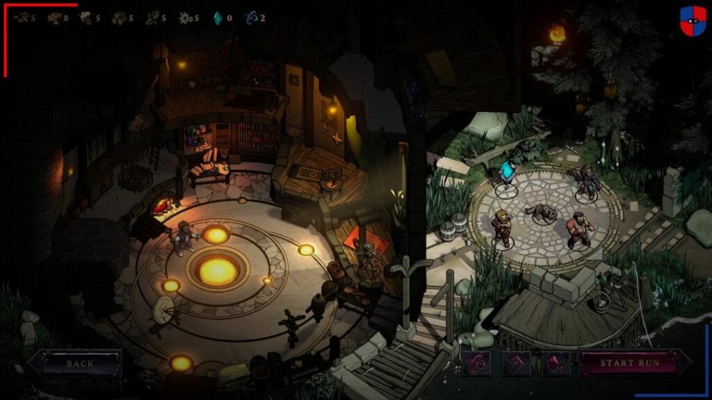 Fuera del fragor del combate, está la gestión del campamento. A fin de que nuestro viaje llegue a buen puerto vamos a necesitar de suficiente madera y comida para mantener la cordura a flote. Por otra parte, la bebida, las hierbas curativas o las piezas de metal, resultan indispensables para poder hacer uso de las ‘habilidades de acampada’ de cada héroe. Si bien al inicio la sensación es de abundancia, es importante no malgastar. Además, determinadas habilidades de combate, como por ejemplo las trampas de oso que puede colocar el arquero, consumen uno o varios de estos recursos. De este modo, el juego nos invita a pensar detenidamente cada movimiento. Blightstone es implacable y cada error se paga caro.