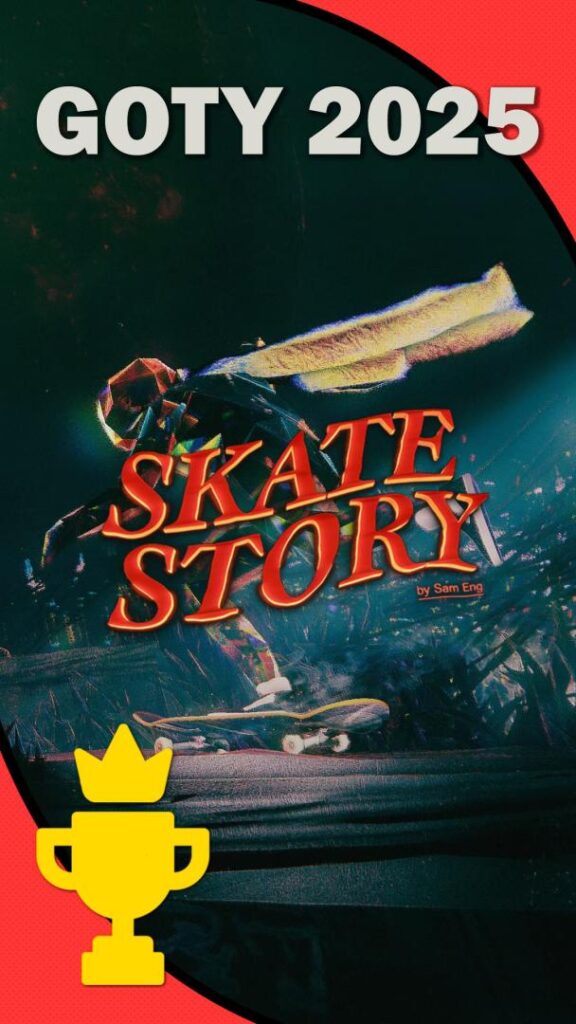 Skate Story es lo más parecido a entrar en un sueño lúcido. Con una estética minimalista donde el protagonista, un demonio hecho de cristal, debe patinar hasta la luna para recuperar su alma, el juego utiliza el skate como una metáfora del esfuerzo y la fragilidad. Patinar se siente sorprendentemente preciso y profundo pudiendo realizar trucos al son de la música de Blood Cultures que se sincroniza con nuestros movimientos. Sin lugar a dudas, una pieza de arte interactivo. Pueden leer nuestra review para conocer más al respecto.