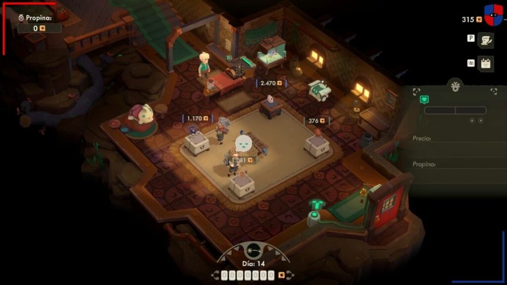Afortunadamente, cuando la mochila se llena de cosas de valor y las cosas se ponen feas en la mazmorra, existe la posibilidad de regresar al pueblo de forma inmediata. Me encantó el hecho de que, después de una noche de peligros, Moonlighter 2 se transforma en algo completamente distinto y fascinante: la gestión de mi propia tienda donde pude vender todo el botín obtenido. Eso sí, no existe una guía que diga cuánto vale cada cosa. La primera vez que puse un objeto a la venta fue un ejercicio de pura intuición. Tuve que observar las reacciones de los clientes para saber si el precio era el indicado, viendo como expresaban alegría ante una ganga o indignación ante lo que consideraban abusivo. Esa psicología del mercado me tuvo más tiempo del que me atrevería a admitir ajustando precios solo para maximizar el margen de beneficio.