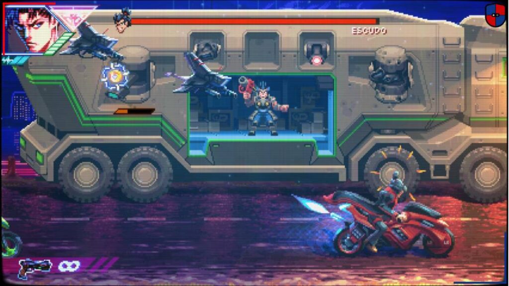 Pero ojo, no todo es miel sobre hojuelas. Neon Inferno cuenta con un sistema de mejoras que pueden adquirirse con los créditos obtenidos tras completar satisfactoriamente una misión. El problema radica en que está algo desaprovechado porque los power ups influyen muy poco. Otra pega está en los puntos de guardado automático. Por lo general se encuentran en puntos poco estratégicos obligando a tener que atravesar secciones más extensas de lo esperado luego de cada muerte. Más allá de estos detalles, el juego se deja disfrutar muchísimo. Además, cuenta con un Modo Arcade que evoca la dureza de las recreativas de antaño ya que debemos completar la aventura de un tirón, sin checkpoints ni segundas oportunidades. También ofrece la posibilidad de cooperativo local para dos jugadores lo que amplifica la adrenalina y el despelote en pantalla.