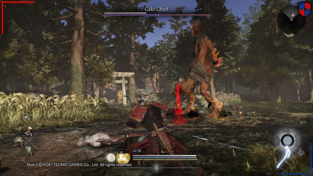 Lo mismo sucede con la exploración, que esta vez cobra un protagonismo mayor. Si prestamos atención a la descripción del equipamiento y Espíritus Guardianes, podemos contar con habilidades pasivas que indican los puntos de interés en el minimapa. Desde la ubicación de los enemigos, pasando por los simpáticos Kodamas, hasta los cofres y actividades secundarias. De hecho, el cambio más importante que introduce Nioh 3 es el énfasis que pone en esta arista. Ahora, en lugar de niveles cerrados en los que había que cuidarse hasta desbloquear el infaltable atajo, tenemos dos mapas abiertos con una gran cantidad de objetivos que podemos completar con absoluta libertad.