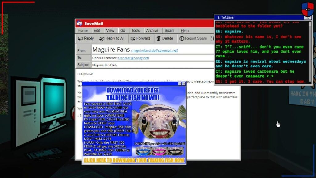 Esta estética se apoya especialmente en la recreación de espacios virtuales abandonados. Los foros olvidados, las mascotas de escritorio, los anuncios invasivos y las interfaces incómodas construyen un entorno que funciona como homenaje y también como una crítica a esa etapa temprana de la cultura digital. Esa donde la interacción anónima daba lugar a relatos perturbadores que hoy ya forman parte del imaginario colectivo. Incluso los diseños de ciertos personajes remiten al horror contemporáneo, con figuras que incomodan pero que también parecen pensadas para trascender en fanarts y reinterpretaciones.
