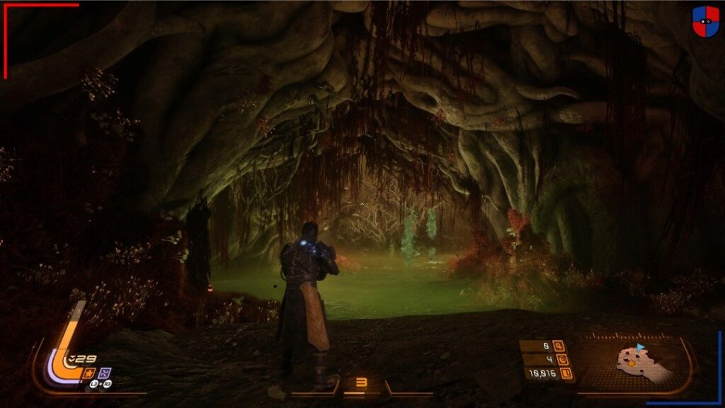 La columna vertebral de Saros es la misma que la de Returnal. Cada muerte reinicia el ciclo, perdemos el equipamiento y la configuración el mapa cambia completamente. No obstante, algunos cuartos permanecen iguales y son claves para la exploración. El otro gran cambio con respecto al anterior trabajo del estudio es que podemos quedarnos con una parte de la experiencia obtenida durante la partida y usarla para mejorar nuestra armadura. Así es como Housemarque nos presenta el árbol de habilidades, con mejoras permanentes que sirven para fortalecer las estadísticas y a mejorar las chances de sobrevivir a cada bioma de Carcosa. Este cambio resulta fundamental para la experiencia de juego y uno de los responsables de quitarle algo de peso a cada muerte que, en lugar de sentirse como una total pérdida de tiempo, se siente como una lección aprendida acompañada de una mejora.