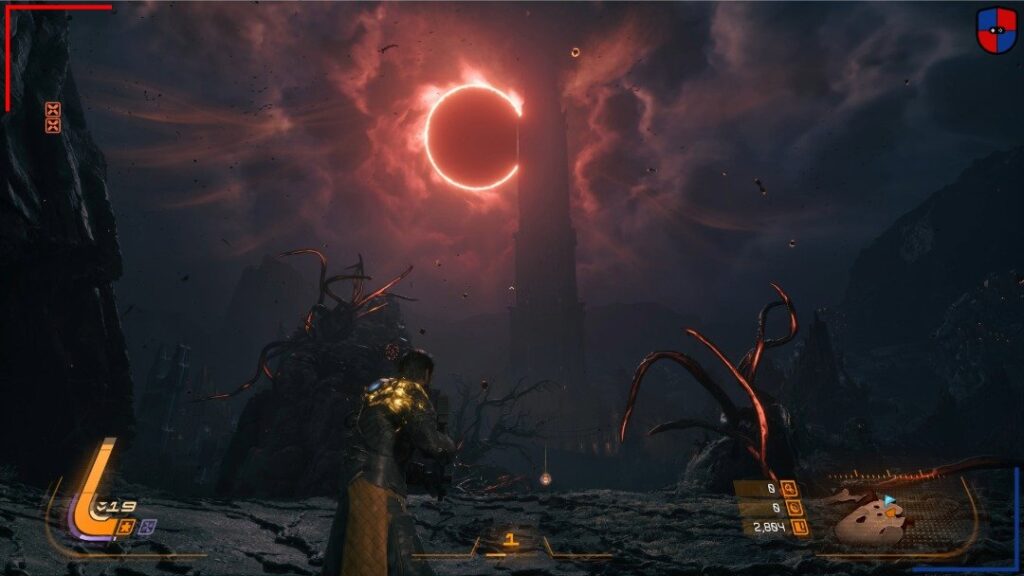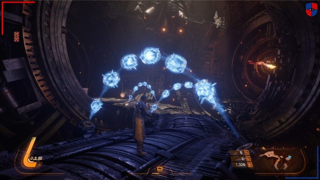 A la hora de jugar, Saros es verdaderamente un manjar. Lo que Housemarque denomina un ‘Bullet Ballet‘ es una mezcla perfecta entre shooter en tercera persona y bullet hell. Con un esquema de control intuitivo que responde de forma exquisita y una propuesta jugable inmejorable, el juego nos mantiene todo el tiempo apuntando, disparando, esquivando, corriendo y cuidando el timing de la recarga de forma orgánica e intuitiva. Todas las armas se sienten útiles y tienen variantes interesantes. Hay rifles de asalto con alta cadencia de fuego, fusiles inteligentes con proyectiles teledirigidos, escopetas arrasadoras, pistolas con munición explosiva, ballestas automáticas y mucho más. Además de nuestra fiel arma primaria contamos con ataques de poder que sólo podremos usar al llenar la barra de energía correspondiente mediante la absorción de proyectiles azules con el escudo, y tienen un daño devastador.