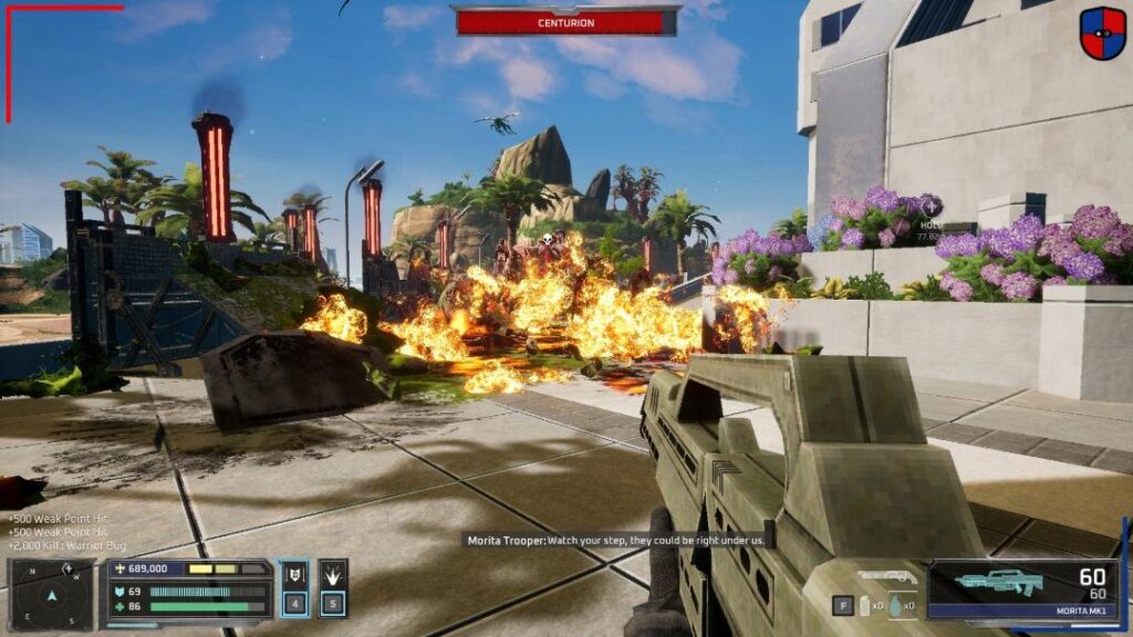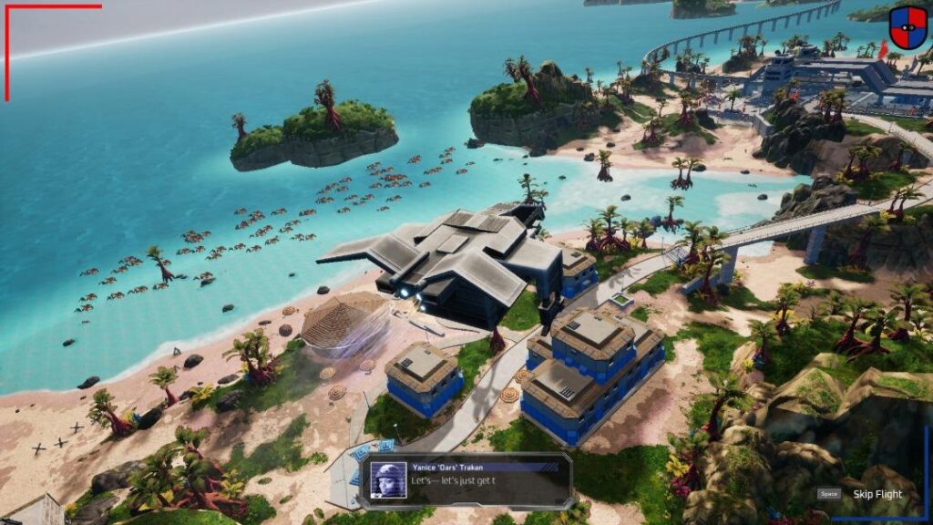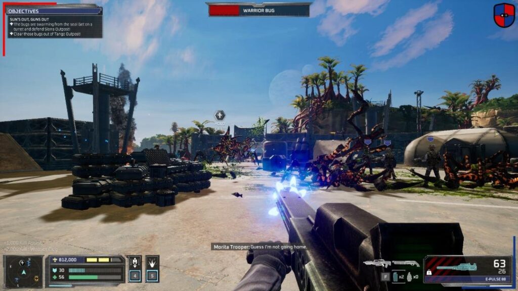 Para el máximo disfrute, seleccione la única misión disponible, liberar Zegema Beach, con la mayor dificultad posible. La verdad es que el juego resultó genuinamente desafiante, pero no imposible por lo que creo que aún hay margen para más dificultad. El comienzo fue muy bueno: una nave nos lleva al planeta y, antes del despliegue, me permitió tener una mirada panorámica de la invasión de insectos. Una vez puse pie en tierra, el objetivo consistía en retomar el control de algunos puntos, destruir fuerzas enemigas, activar consolas para recuperar el funcionamiento de estructuras humanas. Todo mientras disfrutamos del ‘splash‘ cada vez que explotaba un insecto dejando a la protagonista empapada con una viscosa sangre verde.