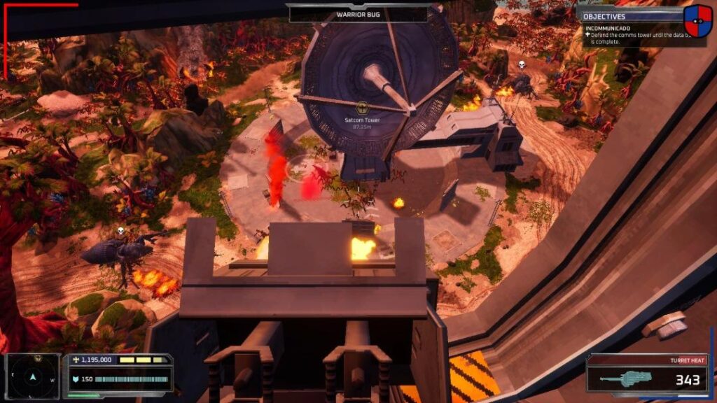 Por otro lado contamos con un digno armamento, teniendo a la escopeta como el arma más placentera. De todos modos, no faltan los fusiles de asalto con munición de plasma, granadas de impacto e incendiarias y muchas cosas más. Además, tenemos despliegues de equipamiento y asistencia aérea (al mejor estilo ‘estratagemas’) donde arrojamos una señal para que en una zona determinada sea bombardeada. Incluso hasta tenemos la oportunidad de hacer uso del asiento de artillería en un vehículo aéreo, lo que aporta cierta variedad al gameplay. A todo esto se suman las estructuras fortificadas que cuentan con torretas defensivas.